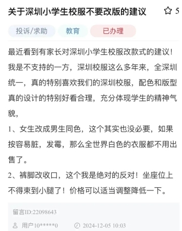 此前,有网友在人民网领导留言板提出,反对深圳小学生校服更改款式。
